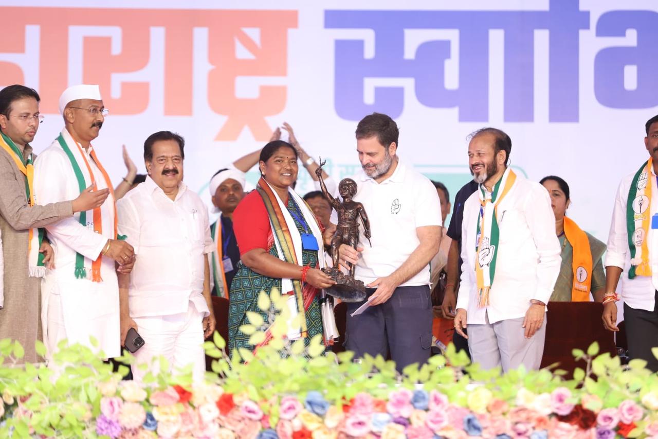 ఉత్తర మహారాష్ట్రలోని నందుర్బర్ జిల్లా కేంద్రంలో గురువారం జరిగిన కాంగ్రెస్ భారీ బహిరంగ సభకి ముఖ్యఅతిథిగా హాజరైన పార్లమెంట్లో ప్రతిపక్ష నేత రాహుల్ గాంధీకి తెలంగాణ పంచాయతీరాజ్ గ్రామీణ అభివృద్ధి, మహిళా శిశు సంక్షేమ శాఖ మంత్రి, ఏఐసీసీ సీనియర్ అబ్జర్వర్ సీతక్క ఘన స్వాగతం పలికారు. పార్టీ కండువా కప్పి రాహుల్ గాంధీని వేదిక మీదకి సీతక్క ఆహ్వానించారు. అనంతరం గిరిజన పోరాట వీరుడు, ప్రముఖ స్వాతంత్ర సమరయోధుడు బిర్సా ముండా ప్రతిమను బహుకరించి రాహుల్ గాంధీని మంత్రి సీతక్క సత్కరించారు. శుక్ర వారం నాడు బిర్సా ముండా జయంతి నేపథ్యంలో సీతక్క బహుకరించిన బిర్సా ముండా ప్రతిమ రాహుల్ గాంధీ ని ఆకట్టుకుంది. బిర్సా ముండా ప్రతిమను అందుకున్న రాహుల్ గాంధీ కాసేపు ప్రతిమను చూస్తూ వుండి పోయారు. అనంతరం ప్రసంగించిన రాహుల్ గాంధీ ఆదివాసి గిరిజనుల హక్కులను కాలరాసే విధంగా కేంద్ర ప్రభుత్వం వ్యవహరిస్తుందని తీవ్రస్థాయిలో విమర్శించారు. ఆదివాసీల ఆస్తిత్వాన్ని, ప్రత్యేక సంస్కృతిని దెబ్బతీస్తున్న బిజెపి కూటమిని ఓడించాలని పిలుపునిచ్చారు. అటవీ హక్కుల చట్టం తో పాటు, వారి రక్షణ కోసం ఎన్నో చట్టాల రూపొందించిన కాంగ్రెస్ను బలపరచాలని ఓటర్లకు విజ్ఞప్తి చేశారు.