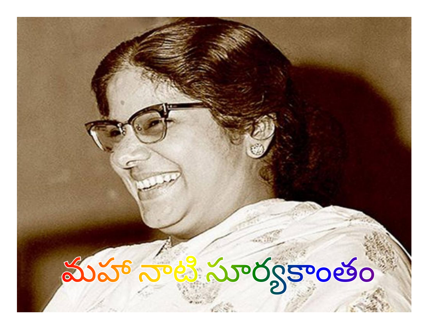 దురుసునోటి పలుకుబడికి పంతులమ్మ మీరు… బాక్సాఫీసు సూత్రానికి పలుపుతాడు మీరే… మీరులేని బయస్కోపు ఉప్పులేని చారు….” అంటూ బాపు కార్ట్యూనులో ముళ్ళపూడి వెంకటరమణ కితాబిచ్చిన ఆ సహజనటి సూర్యకాంతం ఆని వేరే చెప్పాల్సిన పనిలేదు. అదే వెంకటరమణ సూర్యకాంతం సహజ నటనను గుర్తుచేస్తూ…. “రొష్టుపెట్టు ఆలిగా, దుష్టు నోటి కాళిగా, నటించుటామె కేళిగా- గయాళిగా నాతిగాని నాతి- లేక గొప్ప చుప్పనాతిగా, ‘’ఏయ్! అబ్బీ!! ఏవిట్నీ బేహద్బీ అని?, తలుపుచాటు కోడల్లా పెద్దమాటలు చాటున్నిలబడి తిడితే తెలీదనీ- తెలిస్తే తెగబడి తిడతారనీ కదూ? నేను కోడళ్ళనీ వాళ్ళనీ వేపుకు తింటున్నాననీ, దుష్టునోరుదాన్ననే కదూ నువ్వన్నదీ? అబ్బీ! ఔగానీ నా దుష్టునోరు లేకపోతే నీలోని జాలి, వాళ్లలోని గుణం, ఎంత అట్టడుగునపడి అఘోరించేవనీ!” అని సరదాగా అంటుండేవారని అభిమాన రచయిత, నిర్మాత ముళ్ళపూడి వెంకటరమణ ఉవాచ. ఈ సురేకారం లాంటి సూర్యకాంతం అలనాటి తెలుగు చలనచిత్ర స్వర్ణయుగంలో గయ్యాళి అత్తగా, అక్కగా, వదినగా, భార్యగా, తల్లిగా తనదైన శైలిలో నటించి తనకంటూ ఒక ప్రత్యేకతను నిలబెట్టుకున్న మహానటి. అటువంటి మహానటి సూర్యకాంతం గురించి కొన్ని విశేషాలు….