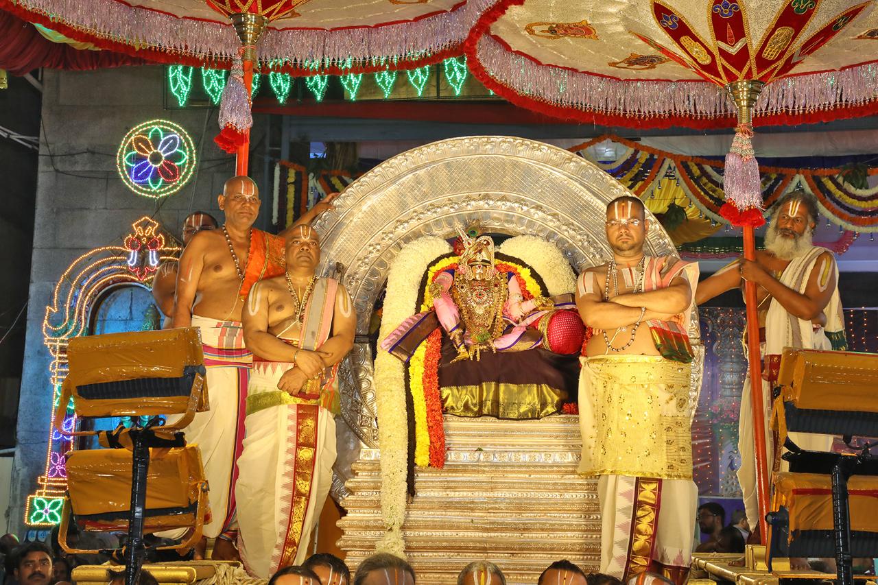 అశ్వాలు, వృషభాలు, గజాలు ముందు కదులుతుండగా మంగళవాయిద్యాలు, భక్తుల కోలాటాల నడుమ అమ్మవారు ఆలయ నాలుగు మాడ వీధుల్లో విహరించి భక్తులకు అభయమిచ్చారు. రాత్రి 7 గంటల నుండి వాహనసేవ సాగింది. అడుగడుగునా భక్తులు కర్పూర హారతులు సమర్పించి అమ్మవారిని సేవించుకున్నారు.