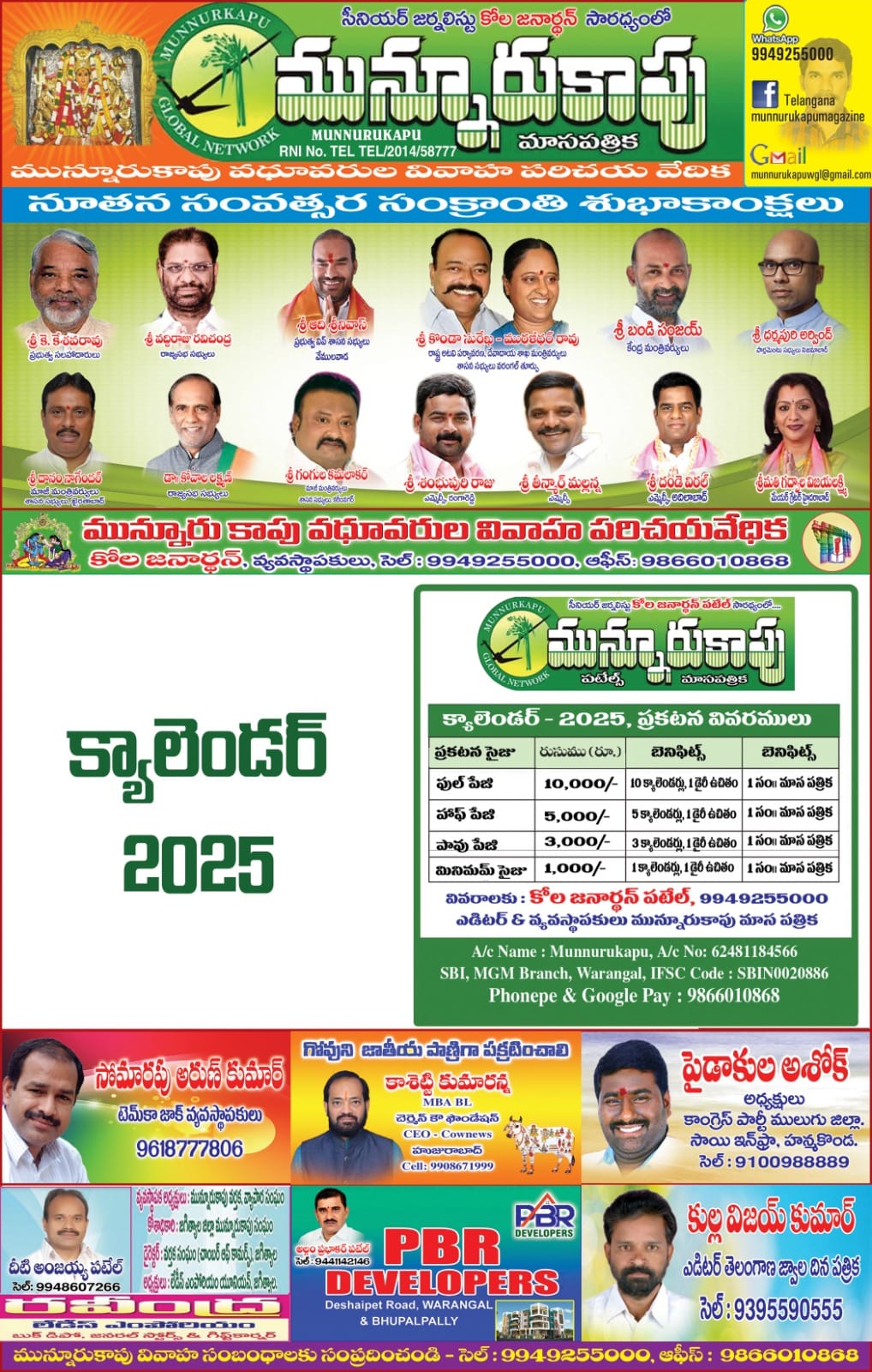 మున్నూరు కాపు మాసపత్రిక ఆధ్వర్యంలో రూపొందిస్తున్న 2025 క్యాలెండర్ ఆవిష్కరణ 15 డిసెంబర్ 2024వ తేదీన నిర్వహించబడును. కావున అత్యధిక సర్కులేషన్ తో అత్యధికంగా ప్రచురించే క్యాలెండర్ లో ప్రకటనలకు చివరి తేదీ నేడు ఆదివారం 8 డిసెంబర్ సాయంత్రం లోపు పంపగలరు. వివరములు సంప్రదించండి కృతజ్ఞతలతో
