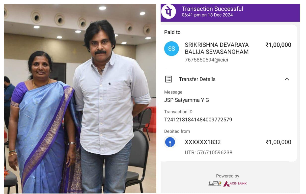 రూ. 1, 00,000-00 (ఒక లక్ష రూపాయలు) విరాళమును సంఘం ఖాతాకు ఫోన్ పే చేశారు.