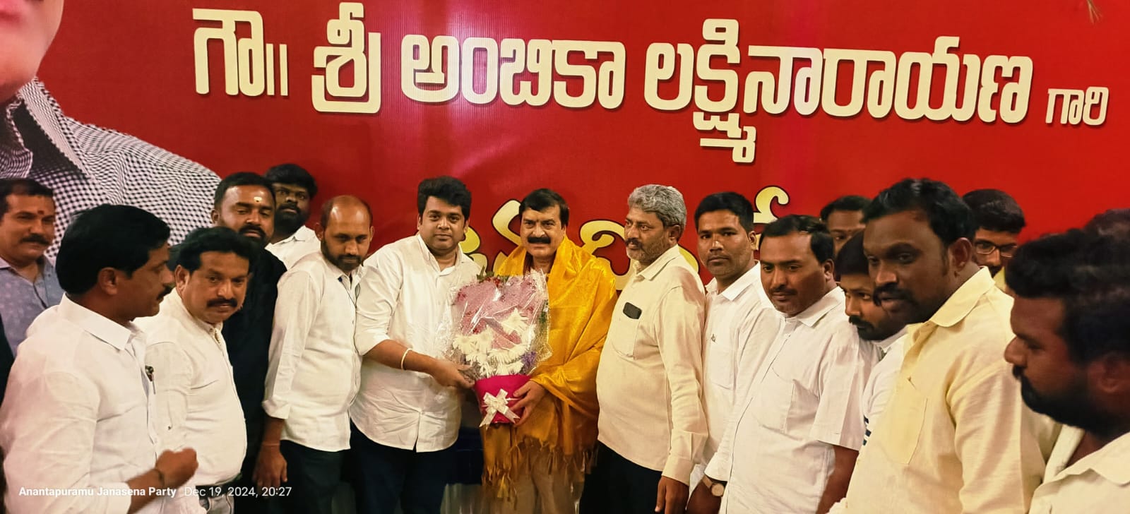 అనంతపురము పార్లమెంట్ సభ్యులు శ్రీ అంబిక లక్ష్మీనారాయణ గారి జన్మదిన వేడుకలు ఘనంగా జరిగాయి. గురువారము ఎంపీ గారి నివాసంలో అహుడా చైర్మన్, జనసేన పార్టీ జిల్లా అధ్యక్షులు శ్రీ టీ.సి.వరుణ్ గారు, శ్రీ అంబిక లక్ష్మీనారాయణ గారి నివాసంలో మర్యాదపూర్వకంగా కలిసి పుష్పగుచ్చం అందజేసి శాలువా కప్పి జన్మదిన శుభాకాంక్షలు తెలిపారు. అనంతపురము పార్లమెంట్ నియోజకవర్గంలో నెలకొన్న సమస్యలపై శ్రీ అంబిక లక్ష్మీనారాయణ గారు పార్లమెంట్లో తన గళం వినిపిస్తూ పలు సమస్యలకు పరిష్కారం చూపుతున్నారని కొనియాడారు. ప్రజల మనిషి అయిన శ్రీ అంబికా లక్ష్మీనారాయణ గారు ఇలాంటి జన్మదిన వేడుకలు మరిన్ని జరుపుకోవాలని శ్రీ టీ.సి.వరుణ్ గారు అభిలాషించారు. అదేవిధంగా నగర అధ్యక్షులు శ్రీ పొదిలి బాబురావు గారు బొకే అందజేసి జన్మదిన శుభాకాంక్షలు తెలిపారు. కార్యక్రమంలో జిల్లా ఉపాధ్యక్షులు శ్రీ అంకె ఈశ్వరయ్య, యువ నాయకులు శ్రీ చైతన్య కృష్ణ, జిల్లా కార్యదర్శి శ్రీ ఇండ్ల కిరణ్ కుమార్, శ్రీ సిద్దు, జిల్లా సహాయ కార్యదర్శి శ్రీ అవుకు విజయ్ కుమార్, నగర కార్యదర్శి శ్రీ కుమ్మర మురళి, నాయకులు శ్రీ సాయి, శ్రీ హిదాయత్, శ్రీ ఉదయ్, శ్రీ వంశి తదితరులు పాల్గొన్నారు