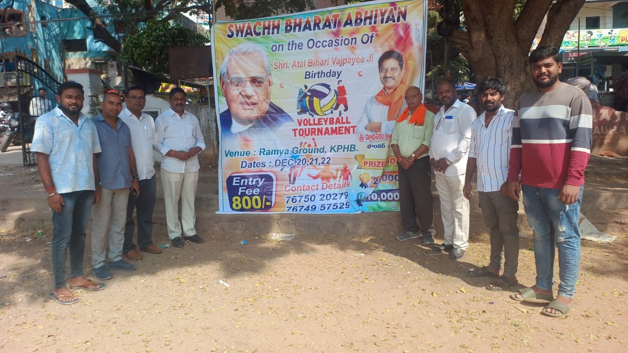 భారతరత్న శ్రీ అటల్ బిహారీ వాజ్పేయి గారి 100వ జయంతిని పురస్కరించుకొని స్వచ్ఛభారత్ అభియాన్ తరపున 10వ సంవత్సరం వాలీబాల్ టోర్నమెంట్ నిర్వహించబడుతుంది డిసెంబర్ 20వ తారీకు నుండి 22వ తారీకు వరకు మూడు రోజులు రమ్య గ్రౌండ్స్ నందు నిర్వహించబడును ఈ సందర్భంగా స్వచ్ఛభారత్ అభియాన్ ఫౌండర్ అండ్ చైర్మన్ శ్రీ మాధవరం కాంతారావు గారు మాట్లాడుతూ యువత ఆటలలో రాణించాలని దేశ గౌరవాన్ని ప్రపంచవ్యాప్తంగా చాటాలని పెద్ద ఎత్తున యువత పాల్గొనాలని చెప్పడం జరిగింది.
