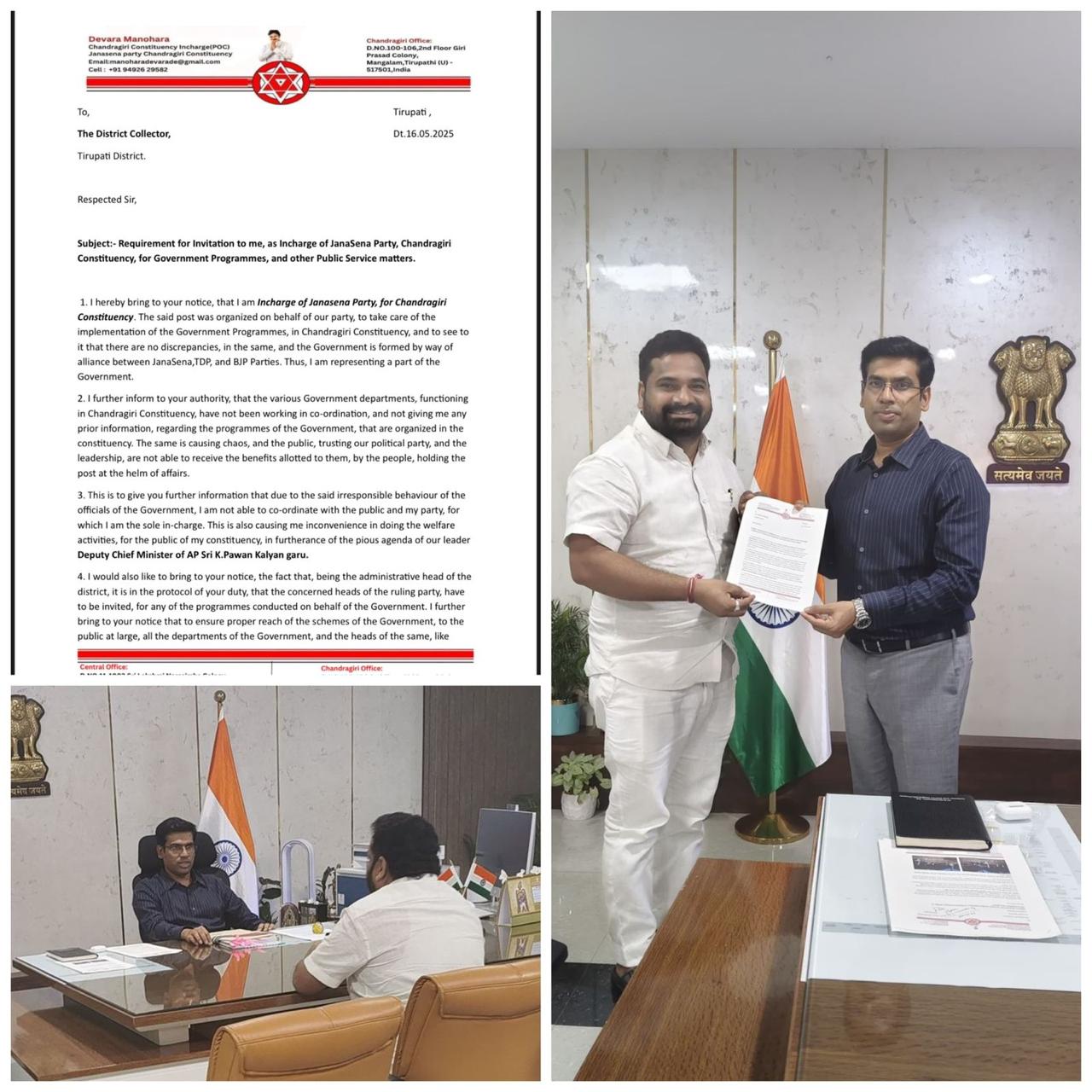 జనసేనపార్టీ కేంద్ర కార్యాలయం ఆదేశానుసారం, జనసేన పార్టీ నియోజకవర్గ ఇన్చార్జ్ దేవర మనోహర్ చంద్రగిరి నియోజకవర్గంలో ప్రభుత్వ కార్యక్రమాల్లో పార్టీ నాయకుల భాగస్వామ్యాన్ని కోరుతూ కలెక్టర్ వెంకటేశ్వర్లుకు వినతిపత్రం అందజేసి ఈ క్రింది ముఖ్య అంశాలు జత చేశారు.