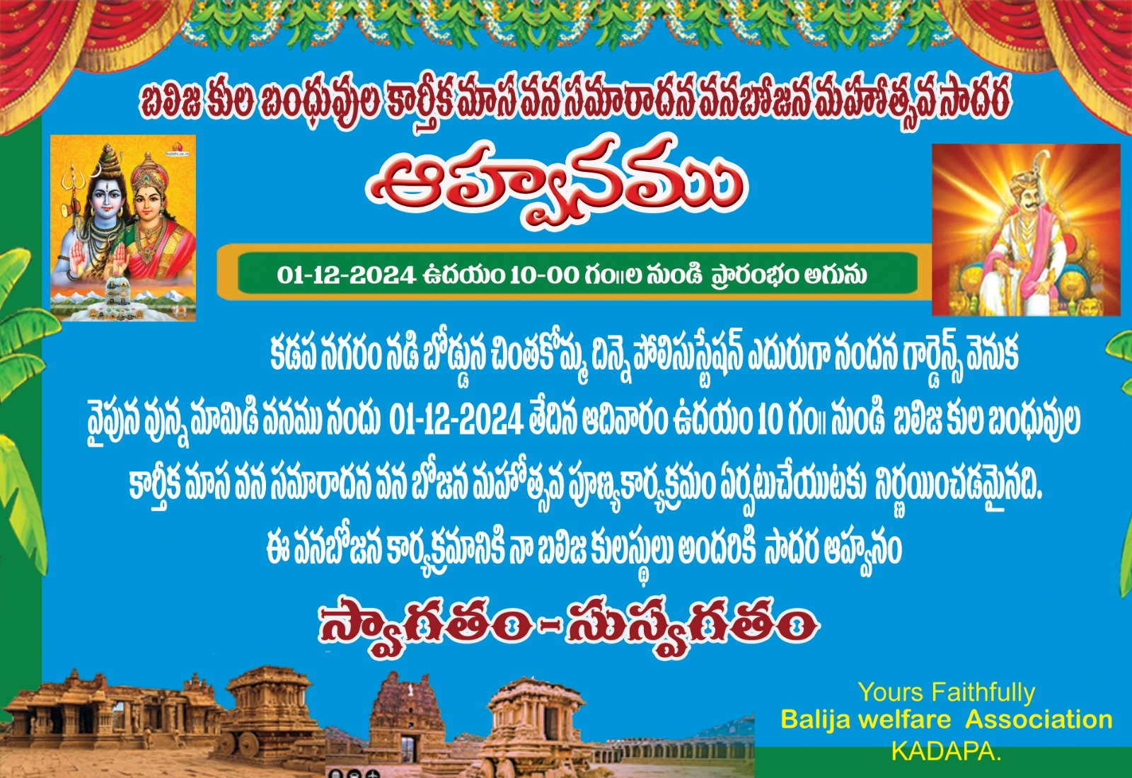 కడపలో బలిజల ఆత్మీయ సమావేశం కడపలో బలిజల ఆత్మీయత పరిచయం కార్తీక మాసం వన భోజనం ఏర్పాటు చేయడం జరిగింది . తొందరలోనే రాయచోటి కార్తీక మాసం వన భోజనం ఏర్పాటు చేస్తాము అని బలిజ నాయకులు చెప్పడం జరిగింది . AD
