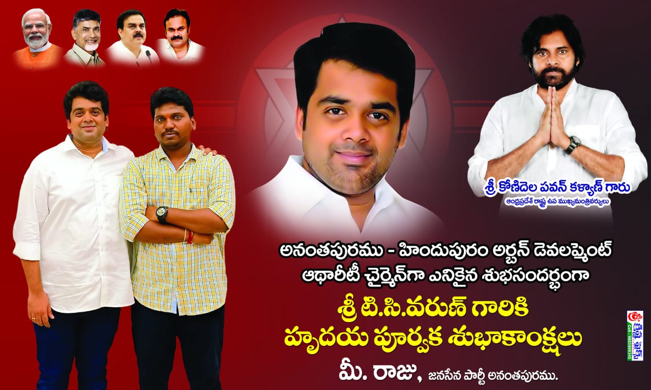 అహుడా చైర్మన్ గా నియమితులైన జనసేన పార్టీ జిల్లా అధ్యక్షులు, అర్బన్ నియోజకవర్గం ఇంచార్జ్ శ్రీ టి.సి.వరుణ్ అన్న గారికి జనసేన పార్టీ నాయకులు పవనిజం రాజు శుభాకాంక్షలు తెలిపారు. జనసేన పార్టీని అనంతపురము జిల్లాలో ముందుండి నడిపించిన శ్రీ టీ.సి.వరుణ్ అన్న గారికి ఈ పదవి రావడం శుభపరిణామం అని పేర్కొన్నారు. ఇలాంటి మరిన్ని ఉన్నత పదవులు వరుణ్ అన్న గారు అధిరోహించాలని రాజు ఆకాంక్షించారు.