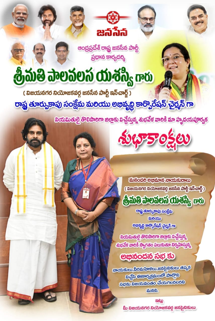 ఆంధ్రప్రదేశ్ రాష్ట్ర తూర్పు కాపు వెల్ఫేర్ & డెవలప్మెంట్ కార్పొరేషన్ చైర్మన్ గా నియమితులై తొలిసారిగా మన విజయనగరం జిల్లాకు విచ్చేయుచున్న శుభ సందర్భంగా “ఘనస్వాగతం” పలుకుతూ అనంతరం జనసేన పార్టీ నాయకుల ఆధ్వర్యంలో..,