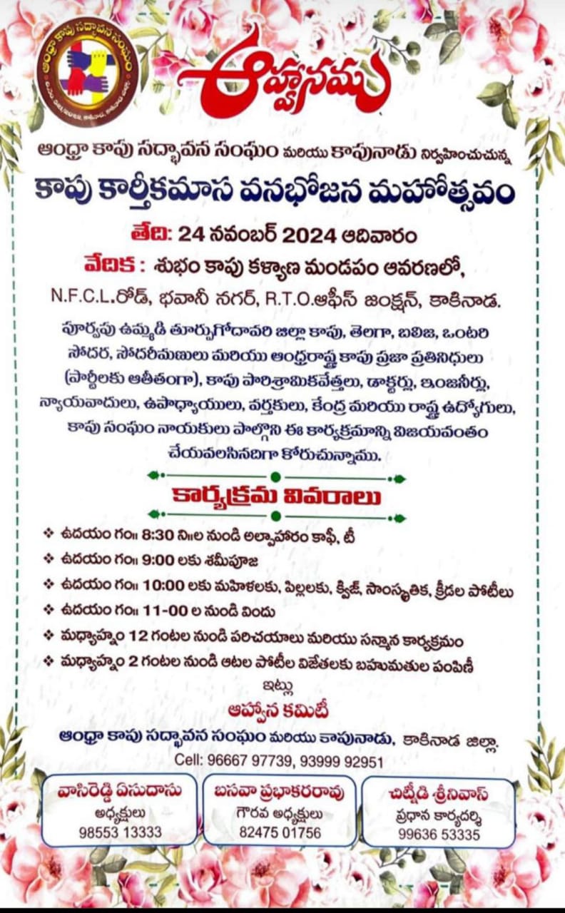 ఈనెల 24న జరగబోయే కాపు కార్తీక మాస వన భోజన మహోత్సవానికి కాపు లందరూ పాల్గొని విజయవంతం చేయాలని ఆంధ్ర కాపు సద్భావన సంఘం, కాపునాడు కాకినాడ జిల్లా అధ్యక్ష కార్యదర్శులు వాసిరెడ్డి ఏసుదాసు, చిట్నీడి శ్రీనివాసు పిలుపునిచ్చారు. కాకినాడ ఎన్ఎఫ్సిల్ రోడ్డులో గల శుభం కాపు కళ్యాణ మండపం ఆవరణంలో జరగబోయే ఈ కార్యక్రమానికి ఆంధ్ర తెలంగాణ నుంచి పలువురు కాపు ప్రముఖుల హాజరవుతున్నారని వివరించారు. ప్రస్తుతం కాపు కులానికి చెందిన ప్రజా ప్రతినిధులుగా పనిచేస్తున్న 22 మంది శాసనసభ్యులు, ముగ్గురు పార్లమెంట్ సభ్యులు, ఏడుగురు ఎమ్మెల్సీలు, మొత్తం 35 మందిని సత్కరిస్తున్నట్లు తెలిపారు. ఐదుగురు మంత్రులతో పాటు డిప్యూటీ సీఎం పవన్ కళ్యాణ్ కార్తీక వనసమరాదనకు హాజరవుతున్నట్లు పేర్కొన్నారు. ఇప్పటికే వీరందరినీ ఆహ్వానించినట్లు అధ్యక్ష కార్యదర్శులు తెలిపారు. సుమారు 30 నుంచి 40 వేల కాపు కులస్తులు కార్తీక మాస వనభోజనానికి వస్తారని అంచనా వేసినట్లు తెలిపారు. వీరితోపాటు గతంలో పనిచేసిన పార్లమెంటు సభ్యులు, శాసనసభ్యులు తోపాటు వైద్యులు,న్యాయవాదులు,ప్రభుత్వ ఉద్యోగులు,ఉపాధ్యాయులు హాజరవుతారని 20 సంవత్సరాలుగా నిర్వహిస్తున్న కార్యక్రమాన్ని కుటుంబ సమేతంగా హాజరై విజయవంతం చేయాలని కోరారు.
