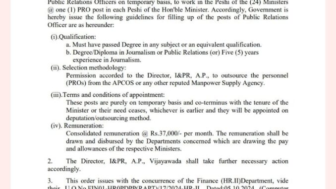 ➤ 24 మంది మంత్రుల పేషీల్లో పీఆర్వోల నియామకానికి మార్గదర్శకాలు జారీ..