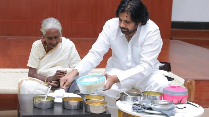 పిఠాపురం నియోజకవర్గం, యు.కొత్తపల్లి మండలం కొత్త ఇసుకపల్లికి చెందిన 96 ఏళ్ల పోతుల పేరంటాలు గారు, ఉప ముఖ్యమంత్రి కొణిదల పవన్ కళ్యాణ్ మీద అభిమానంతో, ఆయన విజయం సాధించాలని వేగులమ్మ తల్లికి పొర్లు దండాలు పెట్టి, అమ్మవారికి గరగ చేయిస్తానని మొక్కుకున్నారు. తన పింఛను సొమ్ము నుంచి రూ.2,500 చొప్పున పోగు చేసి, రూ.27వేలతో గరగ చేయించి సమర్పించారు. ఆమెకు తనతో కలిసి భోజనం చేయాలని ఉందని తెలిసిన వెంటనే, ఈ రోజు పేరంటాలు గారిని క్యాంప్ కార్యాలయానికి ఆహ్వానించి, ఆవిడతో కలిసి భోజనం చేసి, చీరను, లక్ష రూపాయల నగదును అందించిన ఉప ముఖ్యమంత్రి