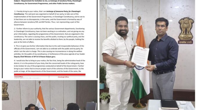 గత సంవత్సరంగా ప్రభుత్వ కార్యక్రమాలకు సంబంధించిన సమాచారం జనసేన నేతలకు అందించడంలో అధికారులు నిర్లక్ష్యంగా వ్యవహరిస్తున్నారు. సమన్వయం లేకపోతే, ప్రభుత్వ సంక్షేమ పథకాల అమలు మరియు నియోజకవర్గ అభివృద్ధికి అడ్డంకులు ఏర్పడతాయని ఆయన హెచ్చరించారు .