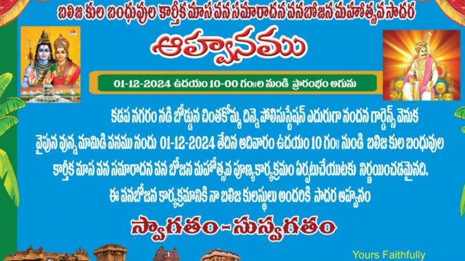 కడపలో బలిజల ఆత్మీయ సమావేశం కడపలో బలిజల ఆత్మీయత పరిచయం కార్తీక మాసం వన భోజనం ఏర్పాటు చేయడం జరిగింది . తొందరలోనే రాయచోటి కార్తీక మాసం వన భోజనం ఏర్పాటు చేస్తాము అని బలిజ నాయకులు చెప్పడం జరిగింది . AD