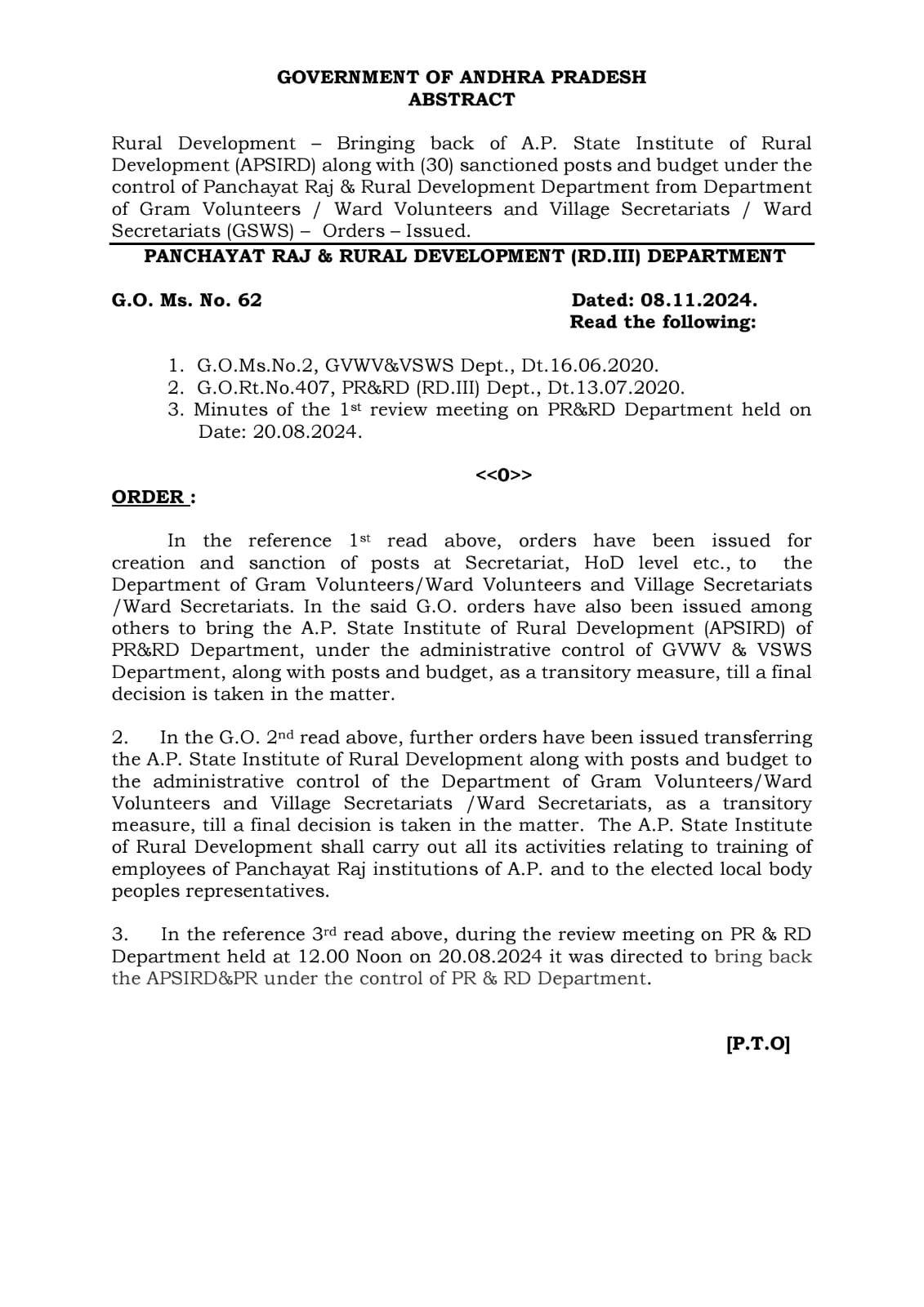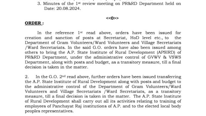 గ్రామీణాభివృద్ధి ఏపీ స్టేట్ ఇన్స్టిట్యూట్ ఆఫ్ రూరల్ డెవలప్మెంట్ ఆప్మెంట్ (APSIRD)తో పాటు (30) మంజూరైన పోస్టులు మరియు గ్రామ వాలంటీర్ల విభాగం/వార్డు వాలంటీర్లు మరియు గ్రామ సచివాలయాలు/వార్డు సెక్రటేరియట్ (GSWS) నుండి పంచాయత్ రాజ్ & రూరల్ డెవలప్మెంట్ డిపార్ట్మెంట్ నియంత్రణలో బడ్జెట్ను తిరిగి తీసుకురావడం పై ఉత్తర్వులు జారీ చేయబడ్డాయి